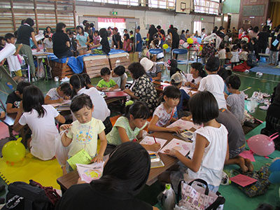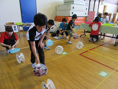 9月9日の土曜日に吉成小学校PTA主催の「てっぺんまつり」がありました。毎年恒例の行事で、児童館でも一つのブースを頂いてコーナーを出します。今年は『手作り風輪でよーいどん!』というタイトルで、風輪を作りうちわであおいで、競争しました。当日は東北福祉大学のボランティアサークル「こっぺぱん」の学生さんの手伝いもあり、盛り上がりました。紙皿で風輪を作り、それに絵を描いたのですが、オリジナリティにあふれた素敵な物が出来ました。うちわであおいで転がすには、コツが必要ですが、すぐに上手に転がしてました。何度もトライする子もいて、楽しい一日となりました。