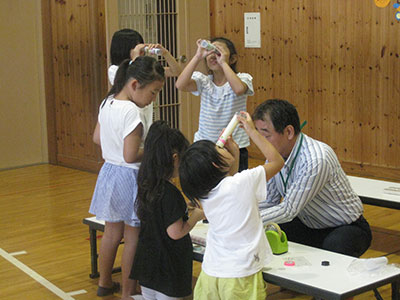 「グリーンハウス勾当台」の方を講師に、万華鏡づくりにチャレンジしました。乾燥した花びらや、種、ビーズなどを選んで、オリジナルの万華鏡を作ります。鏡をのぞきながら「パーツを入れすぎたかな。」「違う色を足そうかな。」と真剣に取り組む姿が見られました。幼児さんも、お父さんやお母さんと一緒に頑張って作りましたよ。出来上がった作品をお友達と交換して見ると…「わあ、きれい!」「○○ちゃんのすてきだよ」とほめあう様子も。宝物が一つ増えましたね。