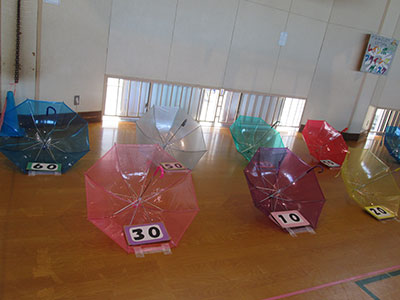 残暑厳しい晴天の土曜日、南吉成小学校PTA主催「森の子まつり」に、児童館もあそびコーナーで参加しました。コーナーは「レインボーフライングディスク」牛乳パックで作った円形のフリスビーを、カラフルな七色の傘に投げて点数を競います。10点~70点、傘の柄に入ったら100点!幼児さんから中学生まで、たくさんの皆さんがチャレンジしてくれました。何回でもチャレンジ出来るので、一度コツと掴むと70点の傘ばかりめがけて高得点をねらったり、くりかえし柄をねらって見事100点!をゲットしたりする子が続出しました。合計点数を更新すると子ども達は大喜び♪ボランティアでお手伝いしてくれた大学生、中学生のお姉さん達も一緒に喜びの気持ちを盛り上げ、会場は熱気いっぱいで、あっという間の三時間でした。