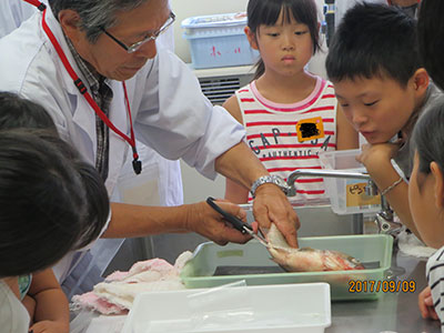 三回目を迎える「わくわくどきどき実験室」の今年のテーマは、「魚の体を調べよう」です。実行委員会の先生方にフナの解剖を指導して頂きました。学校では経験することができない貴重な実験に、二年生~六年生が参加しました。