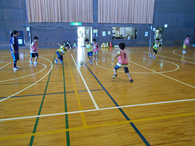 ドリブル練習では「まわりをみながらドリブルをする」「人がいないところを探してドリブルをする」などコーチのアドバイスを聞き、子どもたちは頑張って取り組んでいました。