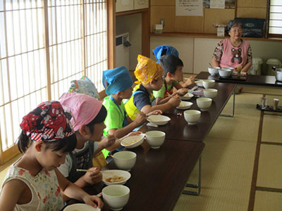 今年も9月は「お月見だんご作り」。申し込みをした子どもたちは、エプロンに三角巾のいでたちで意欲満々。子育て支援クラブの皆さんの手ほどきを受けながら、白玉粉をこね始めました。ところが手にべたべた張り付くばかりで中々まとまりません。「こんな風に力を入れて、真ん中に押し付けるように!」のアドバイスで、ようやくひと塊になり一安心。小さく丸めてお団子に。コロコロ、コロコロ、大小様々の球ができたところでぐらぐら煮立った大鍋に…真っ白なふわふわお団子になりました。後はみたらし餡をかけて、支援クラブさんが点ててくれたお抹茶と一緒にいただきました。中秋の名月には少し早かったけれど、おいしいお月見になりました。