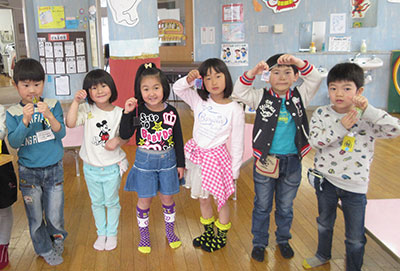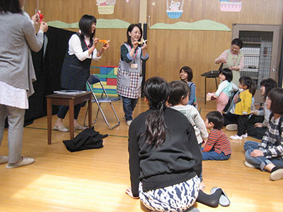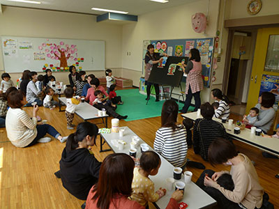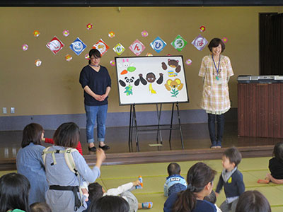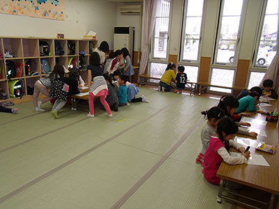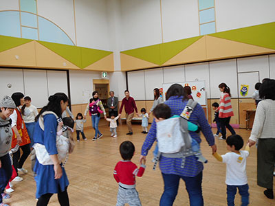 2017/04/19本日の遊びのメニューは、ゲーム・お母さんとのふれあい遊び・お絵描きです。 子ども達は、名前を呼ばれると大きな声で「はい」と上手にお返事。タンバリンタッチも「パン!」と勢いよく叩く姿に「やっぱり集団の力ですね。」と目を細めるお母さん。