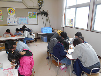 自己紹介ゲームを通して、友達と仲良く握手をしながら会話もはずみ、友達の輪も広がったようです。たくさん体を動かした後は、思い思いのクレヨンでチューリップの絵を描きました。完成した絵を、ひとりひとりみんなの前で褒めてもらうと、どの子も満面の笑み。親子で一緒に楽しみ、お互いの子ども達の成長も喜び合う、とても良い機会になったようです。