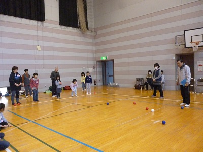 当日は小学生が28名、「ボッチャ水の森」の皆さんが10名参加し、和やかに楽しい雰囲気で行われました。小学生2名、大人1名のチームで、15チームがトーナメントで優勝を目指して戦いました。楽しく簡単な競技で、試合が終わっても、物足りず、「もっとやりたい。」という子どもたちがたくさんいました。