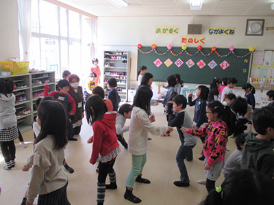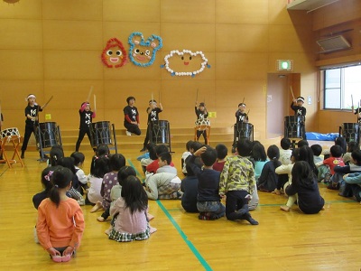 春休み前の22日、子育て支援クラブ長町おだづもっこさんとの共催で行ったこの行事には約100名の参加がありました。長町で練習をしている阿吽太鼓(あうんだいこ)の小学生9名による演奏は、掛け声やポーズもかっこよく迫力ある太鼓の音にみんな驚いていました。メンバーの中には児童クラブのお友達も数名いて、真剣に太鼓をたたく姿にみんな声援を送っていました。よさこいは伊達たぬきさん3名の演舞に続き、振りを教えてもらいながら鳴子を持って全員で踊りました。地域で活躍する二つのサークルの発表を通し、和の文化に親しむ良い機会となりました。