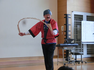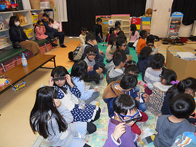 春のお楽しみ会。1つめは、受付での糸引きあめ。大きさの異なるあめを引いて運試し。2つめは、あめを舐めながら観る3D映画会。県民共済さんのご協力のもと、いつもの遊戯室が3D映画館に変身し、50名の参加者が楽しむことができました。
