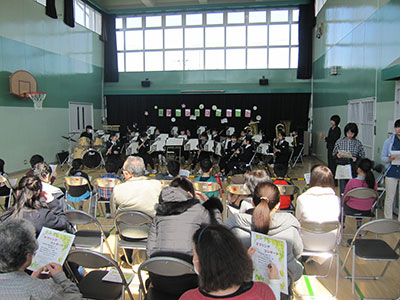 午前10時30分から遊戯室を会場にスプリングコンサートを開きました。加茂中学校の吹奏楽部のみなさんに演奏していただきました。中学生の自己実現の場を作り、地域間交流を促すとともに小学生の情操教育の場面としては絶好の機会です。そして、進行役には地域のジュニアリーダー3人が活躍してくれました。