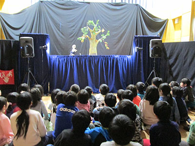 人形劇の舞台が現れ、いつもとは違った遊戯室に子どもたちはそわそわ。「こんにちは!」元気な声で、人形劇はスタートしました。生で見る人形劇は、テレビとは違い、迫力満点!次々と変わる人形劇の場面と、演じ手の7色の声や迫力に、子どもたちは釘付けでした。合間に「ペンシルバルーン」でホットひとやすみ。選ばれた子はドキドキ・わくわく。素敵なバルーンをプレゼントされました。「3枚のお札」では、人形に向かって「うしろ!」「いそげ!」など、子どもたちの小僧さんに一生懸命大きな声で教えてあげている姿がとても印象的でした。あっという間の1時間。子どもたちは飽きることなく最後まで楽しむことが出来ました。