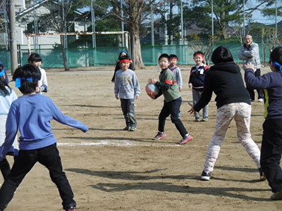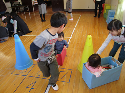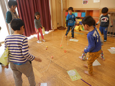 卒業式で1年生から3年生が休みとなったこの日、10:45~11:30の45分間、小学生21名(希望者)と幼児9名が遊戯室でいっしょに遊んで楽しいひと時を過ごしました。小学生は、ボーリング、さかなつり、的あて、押し車、わなげの5つのお店を開いて幼児さんたちを遊ばせてあげたり、「げんこつやま」というパネルシアターをして楽しませてあげたりしました。小学生は、幼児さんたちを喜ばせようと、お店やパネルシアターの準備に意欲的に取り組み、成長を感じさせる仕事ぶりでした。