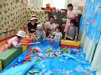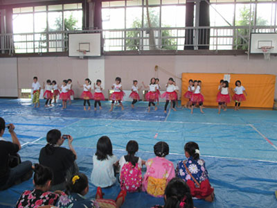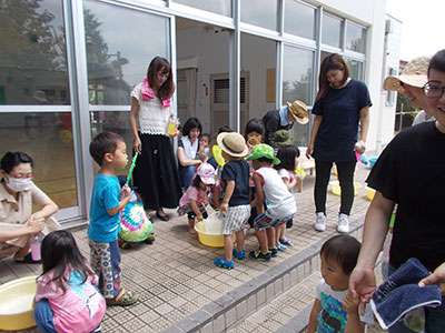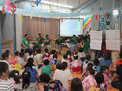2017/07/22毎年恒例の「夕涼みコンサート」。今年も色とりどりのゆかたや甚平を着て、幼児・小学生から大人まで、たくさんの方が参加してくれました。ミニ縁日コーナーで水ヨーヨー釣りや千本引き、うらないを楽しんだ後、冷たいアイスを頬張ったら、いよいよコンサートの始まりです。今年は弦楽合奏団「ゲッゲロ・ゾリステン」の皆さんをお招きしました。バイオリンの素敵な音色に大人も子どももうっとりしたり、目覚まし時計や紙やすりも楽器になってびっくりしたりと、楽しく演奏が続きます。そして、ラストは「勇気100%」と「ビリーブ」。バイオリンに乗せて、子どもたちの元気な歌声と優しい歌声が児童館いっぱいに響き渡りました♪