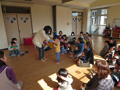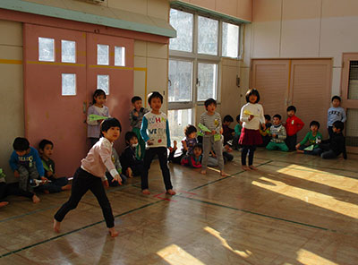 当日は、幼児から地域のお年寄りの方々まで、幅広い年代の人々が集まる中、まずは、東北弁では、頭・まゆげ・目・など体の部分の名称は何というかと言う質問からはじまりました。さすが秋保地区のお年寄りの方々は、パーフェクトに答えることができました。そうやって、場が盛り上がり、笑いが飛び交う中、子どもたちにもわかりやすい落語がはじまりました。いつのまにか、会場一つとなり、