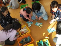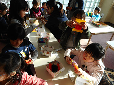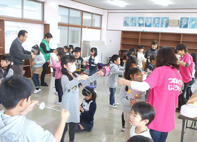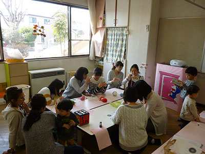 2017/02/16小学校からの要望により昨年度から始まった出前児童館。民生委員さんのご協力のもと、年に3回、授業参観後の保護者懇談会の時間にゲームと工作の遊びの提供をしました。