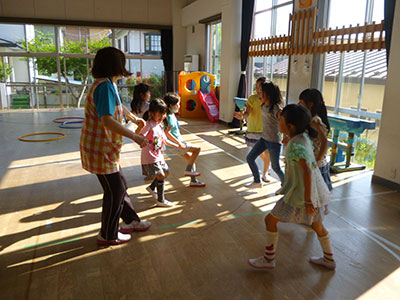 今回のチャレンジデーの「昔遊び」は、参加者が全員女子という大変めずらしい行事でした。コマの長回しをしていた子供達が、勝った負けたと言い合ううちに、「花いちもんめ」が自然と始まり、全員が2つのグループに分かれていました。じゃんけんに勝つと、笑顔で「勝って嬉しい花いちもんめ!」と大きな声で言い、誰を選ぶか真剣に話し合ったり、一人になってしまい心細そうになったりでした。1回終わると汗びっしょりになり休憩です。水分補給が終わると、「もう一回!」とみんなやる気満々です。「花いちもんめ」って、こんなに熱くなる遊びだったかしらと思わず苦笑いしてしまいました。参加した女子全員が、楽しかったと大満足の昔遊びでした。