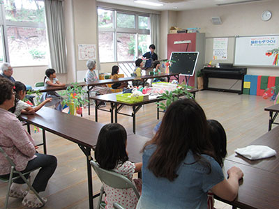 地域の折り紙ボランティア「紙ふうせん」協力・吉成市民センター共催で、チャイルドスクール「仙台七夕づくり」が開催されました。始めに仙台七つ飾りの由来を学んだ後、いよいよ飾り作りのスタートです。ボランティアのおばあちゃんたちが小学生一人ひとりに付き、優しく作り方を教えてくれました。小学生の元気とかわいさにおばあちゃんたちもニコニコ顔です。一緒に立派な小竹飾りを完成させました。最後に、「おり姫と彦星」のブラックパネルシアターを見たり、ギターの生演奏による「たなばたさま」を歌ったりして楽しみました。会場がひとつになり、心温まる会となりました。ボランティアのみなさん、ご協力ありがとうございました。
