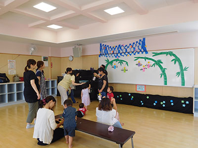 2~3歳児親子の自由参加の会「にこにこ広場2・3歳」です。この日はかわいい七夕飾りを作りました。個性豊かなおり姫・ひこ星に、願いをこめた短冊をさげて出来上がり。親子のふれあい遊びや季節の歌もお母さんと一緒に楽しみました。