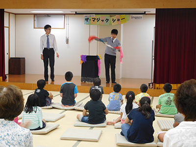 六郷児童館と市民センターでは、日々部活動などで鍛えている高校生の持てる技を、地域の皆さんに発表し伝え共に楽しんでいく「六郷クラブ」という活動を行っています。今回のマジック部の皆さんはその第一回目。小学生が参加できるものもあり、また、地域の方もたくさん見に来てくれ、和やかな「六郷クラブ」のスタートをきりました。