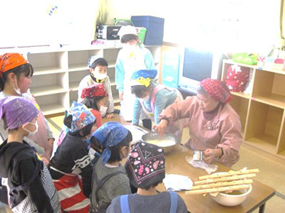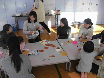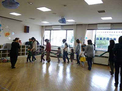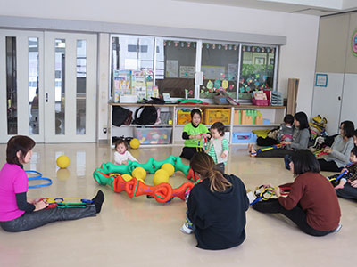2017/01/27資格を持つ職員による、ベビーマッサージ教室を行いました。当日参加したのは、月齢3か月~8か月までのかわいらしい赤ちゃんたち。最初は緊張気味だった子たちも、大好きなママとのふれあい遊びが始まるとにこにこ大喜び。続いて、わらべうたに合わせて足やおなか、腕、背中、顔とマッサージをされると、うっとりとして気持ちよさそうでした。ママたちの優しい語りかけとアイコンタクト、肌と肌の触れ合いによって、みんな穏やかでゆったりとした時間を過ごすことができました。終わったあとは、お茶を飲みながらのおしゃべりタイム。ママたちの話題も尽きず、親子共充実した楽しいひとときとなりました。