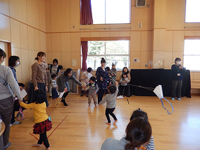 まずは『ラーメン体操』、『手遊び』、『絵本の読み聞かせ(十二支のしんねんかい)』でウォーミングアップ。その後、子どもたちは今回のメインとなる『たこづくり(凧揚げ会)』に挑戦しました。作り方は簡単。①たこの紙に絵を描く②たこ糸をつける③ストローにたこ糸をとおす(持ち手用) 以上で完成。さっそく凧揚げ開始です。走り回るだけで凧は揚がります。子どもたちは会場の遊戯室を行ったり来たり。お母さんからの応援の拍手をもらい、子どもたちは大はしゃぎ。お正月ならではの、楽しい行事となりました。