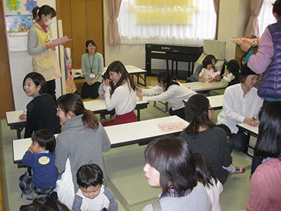月に一度の「ママカフェ」の時間です。いつものように遊戯室で遊んだ後は、場所を移してのティータイムとなりました。温かいお茶にママたちもほっと一息。同じくらいの年齢のお子さんを持つママ同士が集まり、おしゃべりも弾みます。この日はゲストに保健師さんを招いての「歯」の健康についてのお話も聞きました。転勤で仙台に来て間もないママもゆっくり情報交換できたかな。