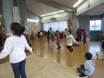 天気が悪く館庭で思いっきり遊べない日が続くこの時季、子どもたちも運動不足になりがちです。そこで「短なわ耐久レース」を4日間に渡り開催しました。得意な跳び方で3分間なわとびを跳び続けるこのレース、単純ながら体力はもちろん気力も必要なのです!止まっても再スタートすれば次の数からカウントを加算していくルールで、最終合計の1番多い人がチャンピオンとなります。ひっかかってもコツコツと回数を重ねた人はなかなかの合計になりますが、途中で心が折れてしまう人も。自分との戦いを制したのは、4日間一度もトップを譲らず、自己記録を更新し続けた3年生の女の子です。みんなの笑顔と汗がキラキラ輝くチャレンジとなりました。