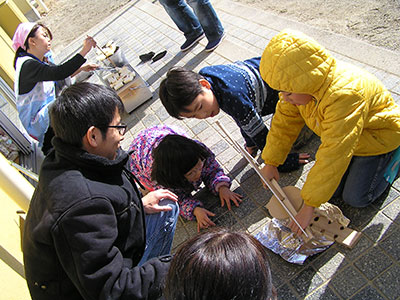 木と木をこすり合わせるマイギリ式火熾し器を使って火をおこします。参加した皆さんは親も子も慣れない作業に悪戦苦闘。なかなか火がつきません。それでも煙が出てきたときには歓声が起こりました。