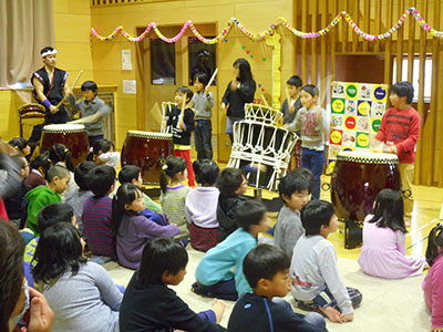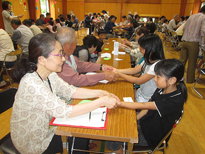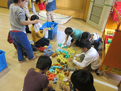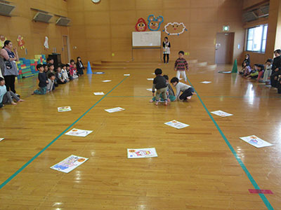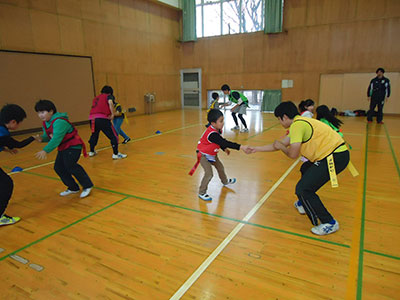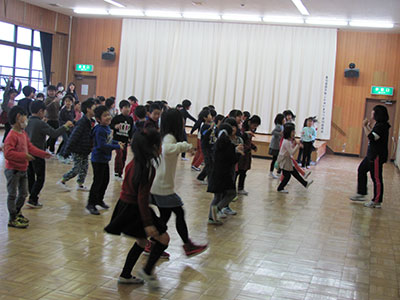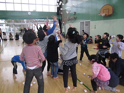 2017/01/05年明け最初の行事は、東北工業大学に留学中の台湾の学生さん3名と一緒の大型カルタ大会で、約50名の小学生が参加してくれました。“台湾版だるまさんがころんだ”と“中国語じゃんけん”で盛り上がった後に、本番の大型カルタ大会をしました。4チームに分かれてチーム対抗で行い、遊戯室に広げた大きなカルタを四隅から走ってとりにいきました。3年生がリーダーとなってチームをまとめ、みんな真剣に勝利を目指してがんばっていました。留学生さんにはけん玉も体験してもらい、楽しい国際交流となりました。