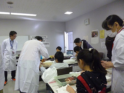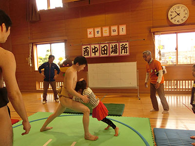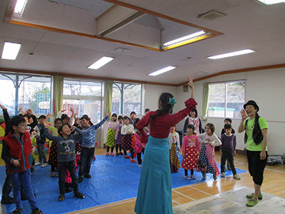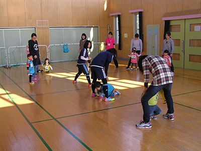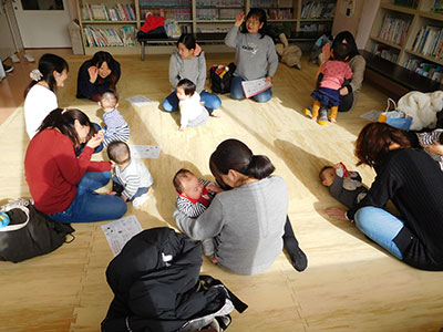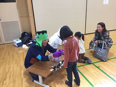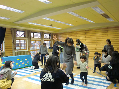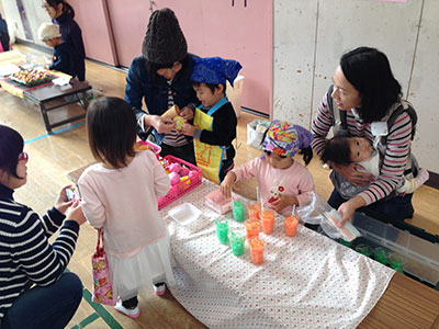 お店の品物を買う時は、紙のお金をお財布から出して、親子で楽しく品物を選んでいました。もちろんエコバック持参です。お店屋さんの時は、かわいいエプロンにバンダナを巻いて、お金を受け取るだけでなく、作業をしたり包装したりと、生き生きと働いていました。「いらっしゃいませ」や「ありがとうございました」の声も聞かれました。幼児クラブ親子だけでなく、職場体験の中学生や小学生にも準備のお手伝いをしてもらい、とても楽しいごっこ遊びとなりました。