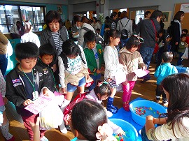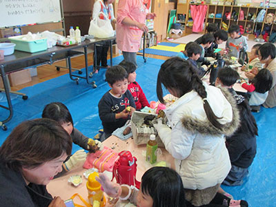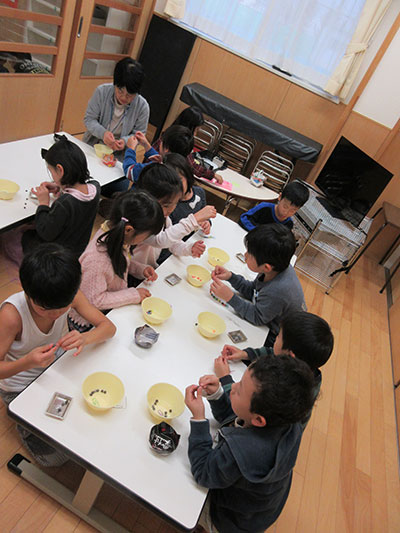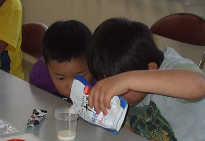 2016/11/07今日は明治乳業の食育講座「バターを作ろう」に小学生16名が参加しました。まずは、栄養士さんから乳牛についてたくさんの事をクイズで学び、さあいよいよバター作りです。小さなカップに生クリームをいれ、みんなで振って、振って、まだまだ振って、しばらく振るとあら不思議。バターのできあがり!振った衝撃で乳脂肪と水分が分離してクリーミーなバターになりました。みんなは大感激。そこにココアをいれてよくまぜると、ココアバターになりました。甘いココアバターをクラッカーにのせて、栄養満タンおいしい手作りおやつのできあがり。早速「うちでも作ったよ」の声もきかれ、美味しくて楽しい行事になりました。