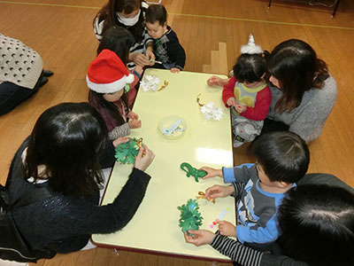 2016/12/20今年もやってきたサンタの季節、いつもとはちょっと雰囲気を変えた装飾の遊戯室でクリスマス会が行われました。幼児クラブ親子の他、多くの赤ちゃん親子が参加してくれました。じゃんけん列車のゲームをしたり、キラキラシールやリボンをつけてリース作りに挑戦したりした後、暗い部屋に光るブラックライトに大歓声!子どもたちは曲に合わせたパネルシアターを観ながら鈴やタンバリンをならしてクリスマスの雰囲気を味わっていました。鶴西のサンタさんからプレゼントをもらいみんなで記念撮影、はじける笑顔に職員も思わず笑顔になりました。プレゼントにもらったお菓子を食べながらのティータイムでは、同じテーブルのお母さん同士も話がはずんで、今年を締めくくる素敵な行事となりました。