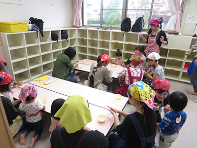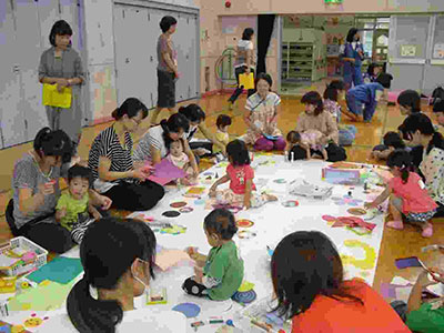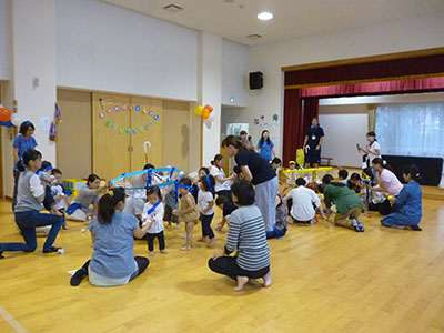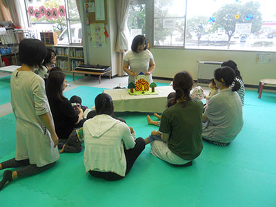 2016/09/30天気に恵まれ、気温もちょうど良い中、高森明泉幼稚園人形劇サークル「ポケット」さんが来館し、「したきりすずめ」「ホネホネロック」「しっぽの気持ち」を見せてくれました。乳幼児合わせて50人以上の参加があり、子ども達は音楽に合わせて体を動かしたり、興味津々で思わず前に出たりする姿が見られました。「したきりすずめ」では、いじわるなおばあさんが出てくると母に抱きついたり、泣きそうになったりしていましたが最後まで真剣な表情で見ていました。曲に合わせて人形が動くのも大喜びで親子で拍手をしていました。最後は舞台に出てきた人形達に親子で手を振って「さようなら」をしました。