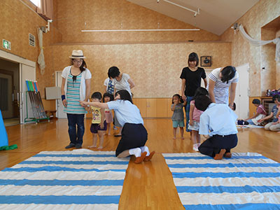 2016/09/09(公財)仙台ひと・まち交流財団交通安全指導課の方々による「にこにこ交通安全教室」を開催しました。みんなが知っているキャラクターの登場する交通安全に関する人形劇で始まり、元気に体操をした後は、横断マットを使っての横断歩道の渡り方の練習です。“かならずとまって”“みぎ ひだり みぎ”を確認し“手をあげて”横断歩道を渡ります。親子とも真剣な表情で練習していました。次は親子分離で保護者向けの講話がありました。その間子どもたちはプレイマットで指導課のお姉さんと仲良くミニカーで遊んでいました。最後はぬり絵のプレゼントもいただき子どもたちはにこにこで、親子とも楽しく交通安全を学ぶことができました。