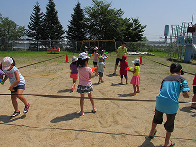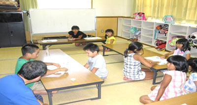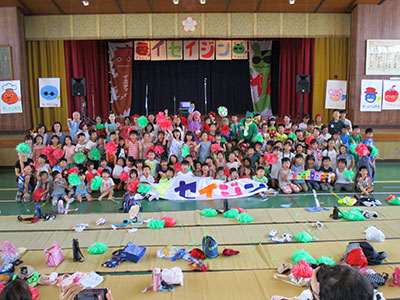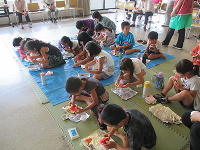 小学生の親と子ども達を対象に、すいかクイズ、すいか割り、すいかタネとばしを行いました。すいか割りでは、子ども達だけでは割れず、パパやママ、職員も参加しましたが、大きなまんまるすいかは傷ひとつなく、結局割れるとこはありませんでした。とっても甘いすいかを食べた後は、大人も子どももタネとばしに挑戦。優勝者は、大人、子ども共に、目安となる3mを飛び越える大ジャンプを記録!第1位には小玉すいかがプレゼントされました。終了後もすいかをおかわりする子が沢山。赤いところがなくなるまで食べ切りました。あぁ、お腹いっぱい。