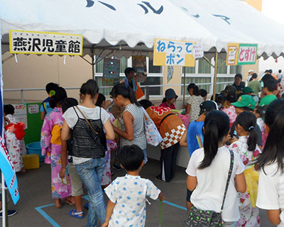 今年で18回目を迎える夏の恒例行事、パルシアパーティーは、近隣の老人施設のお祭りです。燕沢児童館では、二種類のゲームコーナーを担当。「とすけ」は今年も子どもたちに大好評。目当ての商品を獲得する為、真剣な表情でくじをひく子どもたちの列が途切れることなく続いていました。そして、水の張ったたらいに浮かぶカップ目掛けてボールを投げ、点数を競う「ねらってポン」。点数によってもらえるお菓子が違う為、子どものモチベーションが上がり、何度も挑戦する姿が見られました。浴衣姿の子どもが数多く見られ、とても涼しげでした。盆踊りの音、焼き鳥の匂い、子どものはしゃぐ声が夕暮れに響き、徐々に夏祭りが盛り上がっていきました。