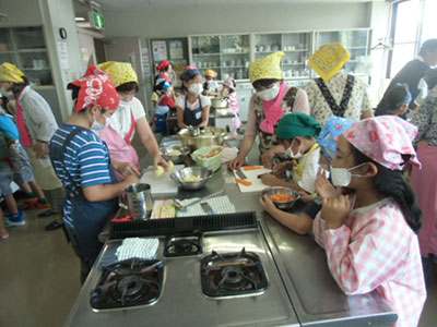 子育て支援クラブ共催の食育事業「黒松半日村」。毎回大好評で、今回も受付け後すぐに満員になってしまいました。包丁を握るのがはじめての子どもたちも、支援クラブのメンバーさんが手をとって丁寧に野菜の切り方を教えてくれるので、安心して楽しんで調理ができました。「玉ねぎが目にしみる」、「後片付けって大変」などの言葉も聞かれ、日頃の家庭における食事の準備・調理を体験することで、感謝の気持ちも芽生えたようです。自分たちで作ったカレーと杏仁豆腐の味は格別!のようで、おかわり続出でした。 中には4杯も食べたというお子さんもいました。次回は3月に行う予定です。お楽しみに!