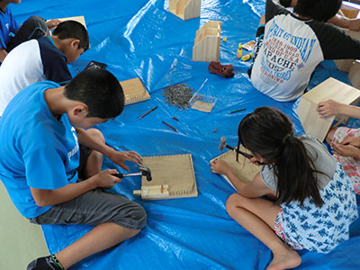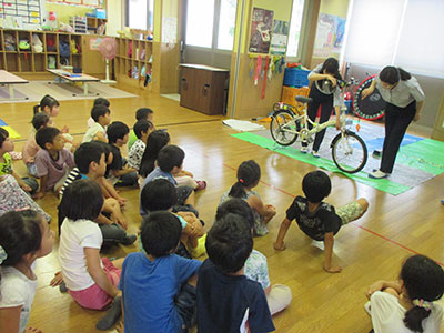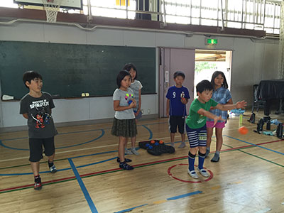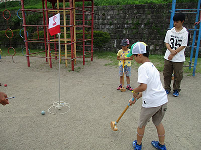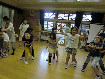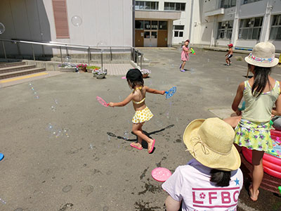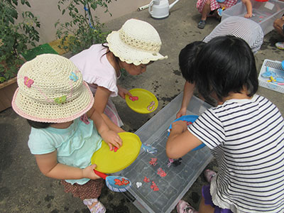 2016/07/30毎年恒例の人気行事「夏のはじまり!水あそび」が今年も開催されました。当日は晴天。しかも朝から気温がぐんぐん上がっていき水あそびには最適な日。最初に室内で自分の名前の書いてある障子紙をじゃばら織にし、染紙あそびの準備をしました。その後、水着に着がえた子どもたちは、染紙あそびを体験し色水コーナー、しゃぼん玉コーナー、水鉄砲コーナーの三つのコーナーにわかれて思い切り水あそびを楽しみました。幼児、小学生のお兄ちゃんと一緒に参加したお母さんもキラキラした目でしゃぼん玉を追いかけたり、水をかけられて大はしゃぎするお子さんの姿をニコニコと見つめていました。最後には、各々が作った染紙のおみやげを手に満足げに帰っていく子どもたちの姿が見られました。