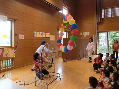 2016/07/23今年は『ふしぎ!たのしい!科学の世界であそんじゃお!!』をテーマに、五感をフルに使った科学遊びで楽しみました。
