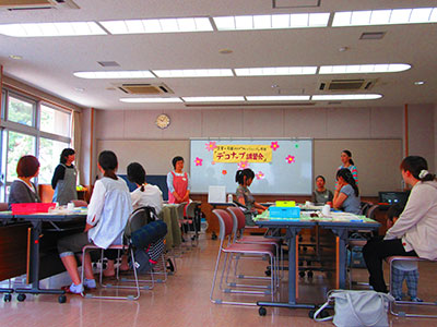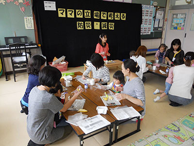 東日本大震災をきっかけに資格をとり、各地で活躍されている防災士『佐藤美嶺』さんをお迎えしての防災講座には、乳幼児親子9組の参加がありました。「ママの立場で考える防災・減災~そなえる・まもる・のりこえる~」をテーマに講演をしていただきました。災害に備えるために必ずやっておくこと・命を守るためのチェックポイント・災害後の困ったを乗り越える様々なアイディア等盛りだくさんの内容でしたが、参加者全員時間を忘れるほど集中していました。後半は子どもたちと一緒に『乾パンバナナヨーグルト』を作りみんなで試食会。乾パンもひと工夫で子どもたちも大喜びのデザートになりました。とてもわかりやすい内容で防災について、あらためて見直す機会となりました。
