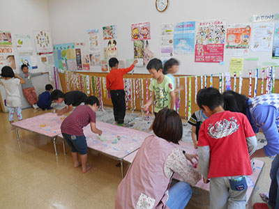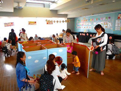 乳幼児親子どなたでもどうぞ、申込みはいりません!のこのお祭り、150名あまりの皆さんが遊びに来てくれました。職員によるオープニングショーの後、各コーナーがオープン。ハイハイ迷路では迷わずゴールまでいけたかな?おめん屋さんには小学生が作ってくれたかわいいお面がいっぱい。地域の民生委員の皆さんと一緒に楽しい輪投げやボーリングで遊んだり、お話ボランティア「きらら」さんと「ぽっぽ」さんによる「おはなしコロリンのお部屋」で楽しんだりと、盛りだくさんのお祭りでした。地域の皆さんのご協力をいただいて、子ども達もママ達も笑顔が輝いた素敵な時間になりました。