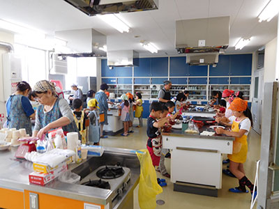 コンコンコン、シャカシャカシャカ。卵を割りときほぐす音が調理室に響きます。民生委員さんにお手伝いをしてもらい、赤・黄・緑色の彩り豊かな三食ごはんとオムレツケーキ作りに挑戦です。参加者の中にはお料理するのも卵を割るのも初めてだという子もおり、緊張しながらパンケーキをひっくり返す姿は見ている方もドキドキしましたが、お料理のベテランさんたちのフォローがあり、とても上手にできました。香りが良い三食ごはんにふわふわのオムレツケーキ、「簡単だからお家に帰ったらお母さんに作ってあげよう!」「自分で作ったから特別においしいね。」とみんな笑顔でおなかいっぱい食べました。