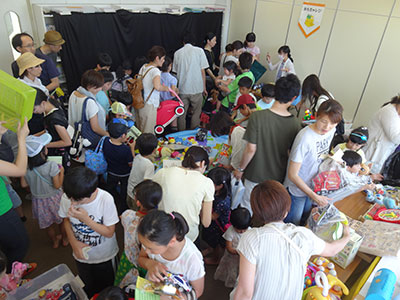 2016/06/118年目を迎えた毎年恒例の『とり+かえっこ』。晴天の下、250名も集まり、大盛況となりました▼おもちゃやさんは、貯めたポイントを握りしめた子どもたちで、バーゲンさながらの熱気。空気砲の射的や早積みカプラでは、ポイントを獲って夢中になって遊びました▼ラストのオークションでは、どんどん上がる値段に「おー!」の歓声!!や競り落とすたびに大きな拍手がおこりました▼たくさんの地域の方にお手伝いいただき、笑顔いっぱいの1日となりました。