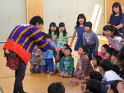 高森東の子どもたちは、コマが大好き。コマ侍のすごい演技に驚いたり、丁寧に技を教えてもらったりしながら、楽しいコマの時間を過ごしました。