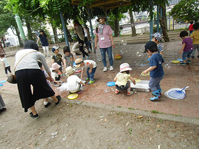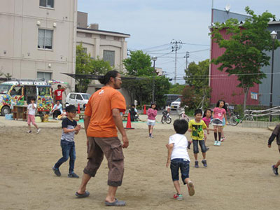 2016/05/28青空の下、荒井4号公園でおにごっこをしました。最初は鬼が段々増えていく「ふえおに」で始まりました。次は「ガッチャン」です。3人ずつのグループにガッチャンとつながって、逃げる人が変わっていくおにごっこです。そして最後は一番みんなが燃えた「しっぽとり」です。最後までしっぽを取られなかった子や、沢山しっぽを取った子が、とても嬉しそうな顔をしていました。冒険あそび場の皆さんにも鬼になって参加してもらい、汗だくになりながら走り回りました。みんな満面の笑みを浮かべ、思い切り体を動かすことができたおにごっこでした。