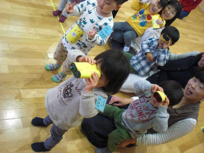今回は、事前に隠しておいた『ひまわり』を探しに、作成した双眼鏡を手に親子で館内探検に出発です。子ども達の「ママ!あったよ!」「見つけた!!」や、お母さん達の「この辺に…あるかもね。」と、優しく誘導している姿はとても和やかでした。作った双眼鏡は、お土産に持ち帰り!!お家でもたくさん探検して楽しんでくれるといいですね。