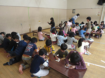 2016/04/27児童館に遊びに来ている小学生全員が参加して、宝さがしを行いました。今回探す宝は、児童館に関するクイズです。「館長先生のお名前はなんでしょう?」「図書室の本は、いつまで借りられるでしょうか?」といった問題が、全部で6つ隠れていました。問題は児童館内だけでなく、館庭の遊具や、なんと館長先生の背中にも!ありとあらゆるところに隠されており、見つけるだけでも一苦労。問題を見つけるたびに子どもたちはチームの仲間を呼んで大騒ぎ。みんなで話し合いながら、問題を解いていきました。活動の最後には、みんなで問題の答え合わせを行いました。9チーム中、全問正解が4チームもいました。ゲームに参加することで、児童館のことを知ってもらう良い機会となりました。