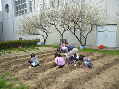 水の森児童館建物の東側にまわっていくと、「子育て支援クラブ」の畑があります。黒々とした柔らかな土がこんもりとした畝になっています。この畑はまだ寒い頃から、子育て支援クラブのメンバーが肥料を入れたり、耕して準備してくれました。当日は、1年生が中心になって種芋を植えました。男爵とメークインの2種類。形や食感の違いなどを教えてもらって納得の小学生。夏休みに、「じゃがじゃがまつり」の行事があります。今日植えたじゃがいもの収穫体験と、カレーライス