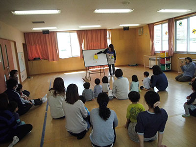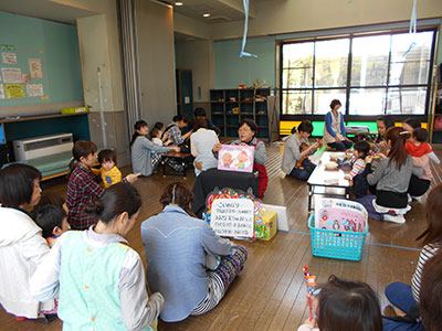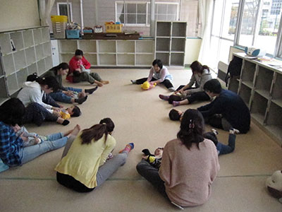 8年度初めての「あかもちゃんひろば」は、まず簡単なストレッチから始まりました。次に参加者と職員の自己紹介をした後、親子ふれあいあそび「にらめっこ」「さるのこしかけ」「おせんたく」と続けて、抱っこしたりくすぐったりして親子遊びを楽しみました。さらに「ことりのうた」をみんなで歌い、絵本「どんどこももんちゃん」の読み聞かせがありました。