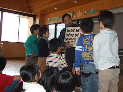生きものクラブ記念すべき第1回目には、14人の生きもの好きの小中学生と2人の大人が集まりました。このクラブは老若男女誰でも参加できます。今年は1年を通して、オオムラサキが成虫になるまでの観察とメダカの飼育に挑戦します。この日のために中庭に移植したエノキの木を見に行くと、オオムラサキの幼虫が枝の分かれ目にくっついているのを発見!別の木についているゴマダラ蝶の幼虫ととてもよく似ているのですが、違いを見つけようと、子どもたちは真剣に観察していました。幼虫は手で触ると死んでしまうので、思わず伸ばした手を慌てて引っ込める様子も見られました。メダカの水槽の引っ越しも完了。2回目の時までの成長が楽しみです。