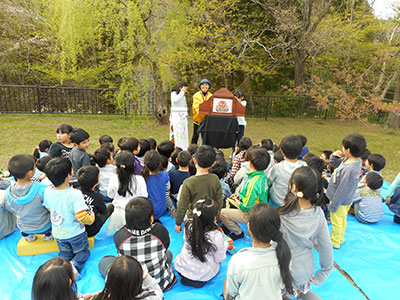 春の暖かな午後に、児童館隣のクローバー畑で恒例のお花見会を開催しました。お花の時期はちょっと過ぎてしまいましたが、児童クラブのお友達の他にも大勢の子ども達が参加してくれ、全部で80人以上の賑やかなお花見になりました。全員でじゃんけんゲームや新しい館長先生にちなんだ〇☓クイズゲームを大さわぎで楽しんだ後は、一転、お話広場の田中さんと大里さんによる絵本と紙芝居を、みんな真剣に聴き入っていました。その後食べたゼリーもとてもおいしかったね!引率やおはなし会の進行などではジュニアスタッフが大活躍してくれて、すてきなお手本となっていました。みんなの笑顔がいっぱいの、とても楽しい新年度のスタートとなりました。