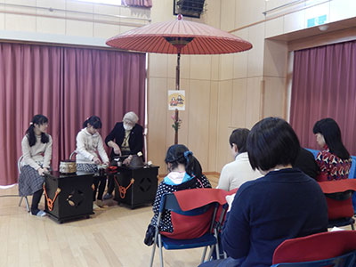 一足はやい『ひなまつりお茶会』が17日に開かれました。今回の特徴は一般(大人)の方々が8名も参加したこと。伺ってみると「クラブ員の我が子が、どんなお点前を見せてくれるか楽しみ。」とのコメントや「秋のお月見お茶会の評判を聞いて申し込みました」というもの。また、「子ども(小学生)に誘われて来てみました」など、きっかけはそれぞれのようでした。お茶を点てるのは橋本先生(裏千家・橋本社中)からお点前のご指導をいただいている茶道クラブの小学生。会場からは、静寂のなかに、ほどよい緊張感が漂ってきます。普段の喧騒はどこにもありません。抹茶を点てる側も、いただく小学生も、心穏やかな一時を過ごしていました。